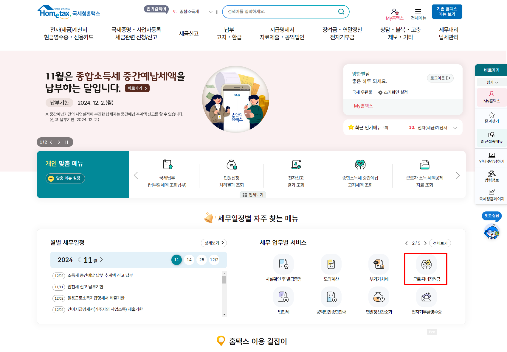 홈페이지 접속 후 세무 업무별 서비스에서 근로장려금 및 자녀장려금 탭을 선택합니다.