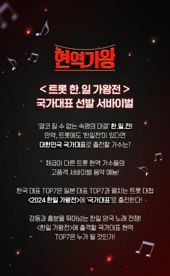 '현역가왕2'는 MBN에서 방영하는 트로트 서바이벌 프로그램으로, 대한민국을 대표하는 남자 트로트 가수 7명을 선발하여 2025년 한일가왕전에 출전시키는 것을 목표로 합니다. 이 프로그램은 2024